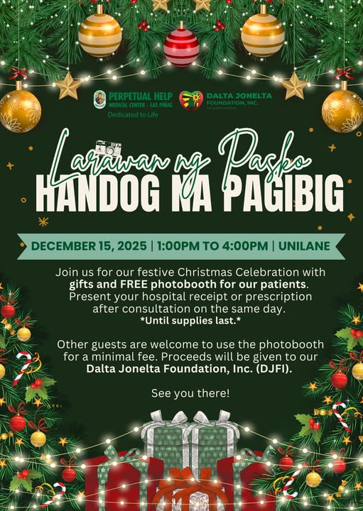 The Customer Relations Team of Perpetual Help Medical Center Las Piñas invites you to our Gift Giving and Photo Booth Activity with the theme, “Larawan ng Pasko, Handog na Pag-ibig”, happening this December 15, 2025, from 1:00 to 4:00 pm at the University Lane.
